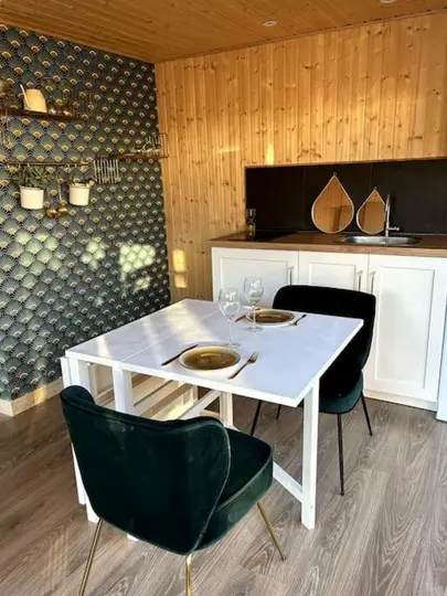 Baigné de lumière grâce à ses grandes baies vitrées, le logement offre une atmosphère chaleureuse et conviviale, parfaite pour un séjour à deux.
