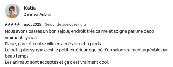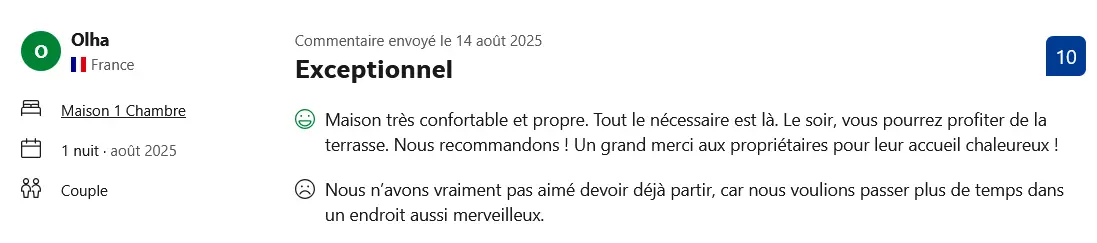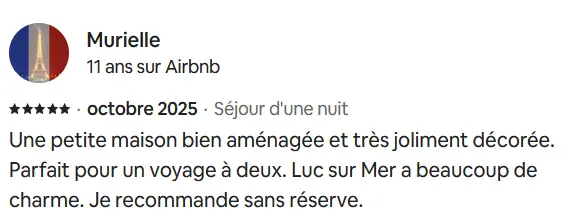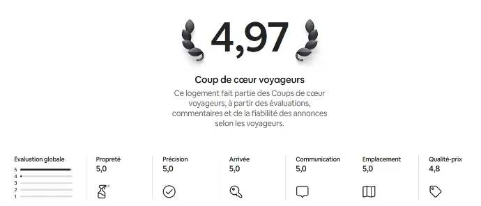 La note globale et les appréciations présentées ici sont issues d’un nombre limité de retours, collectés sur différentes plateformes de réservation telles qu’Airbnb et Booking.