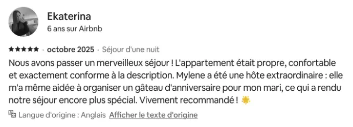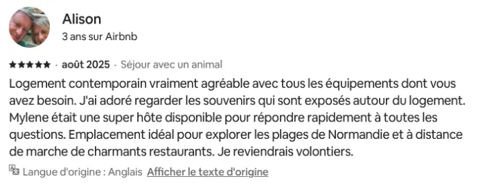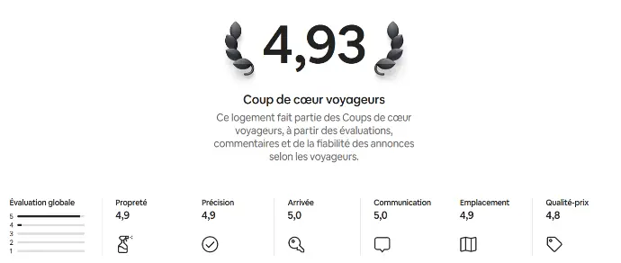 La note globale et les appréciations présentées ici sont issues d’un nombre limité de retours, collectés sur différentes plateformes de réservation telles qu’Airbnb et Booking.