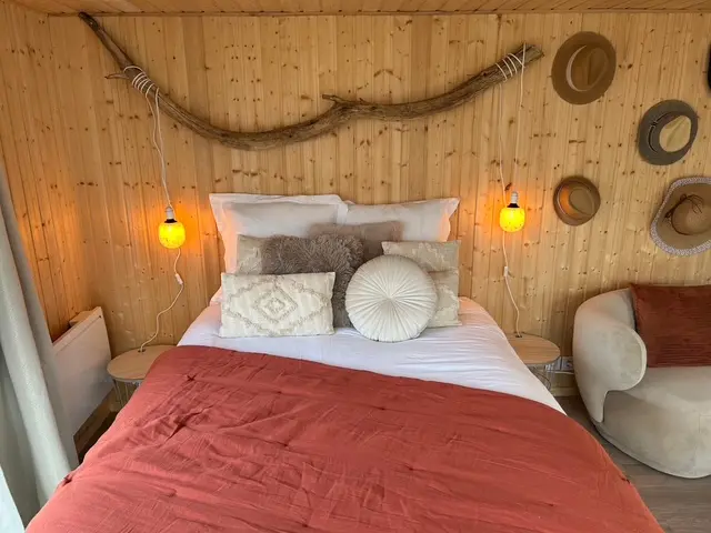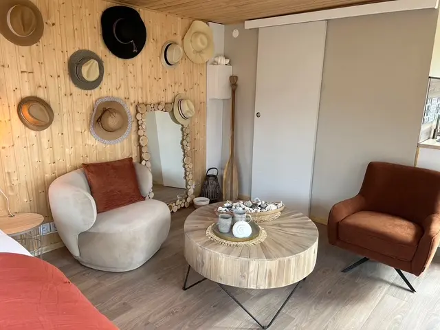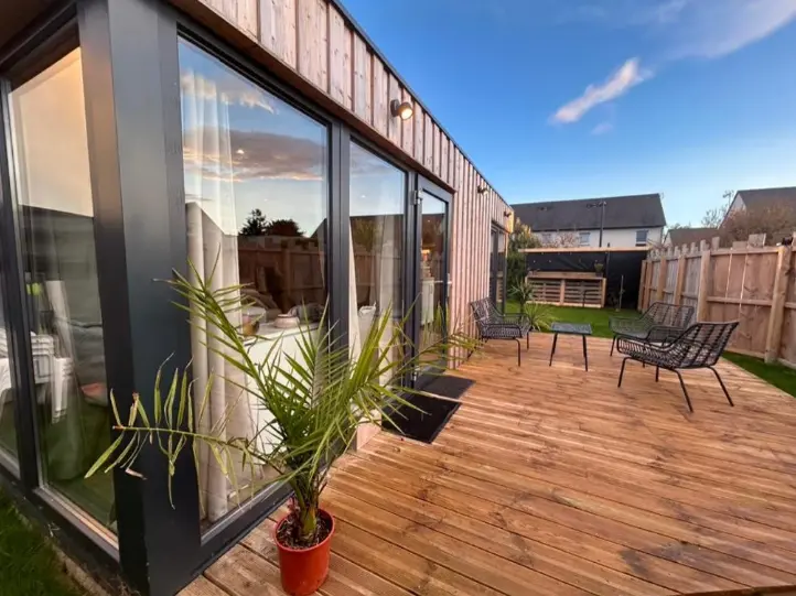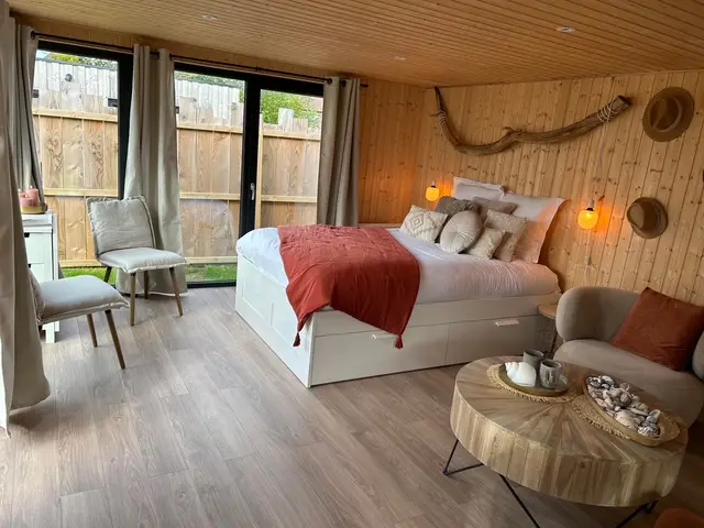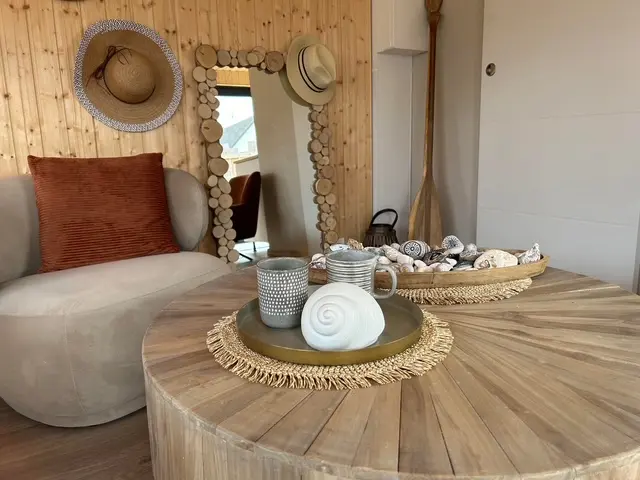 Installez-vous dans Le Coquillage, un chalet en bois de 30 m² situé à Luc-sur-Mer, pensé comme un véritable cocon pour un séjour placé sous le signe du calme et de la détente.