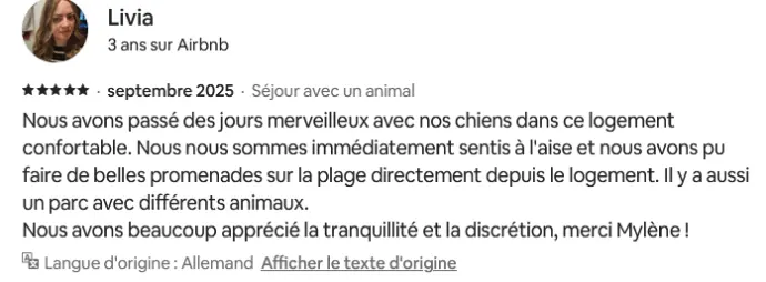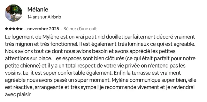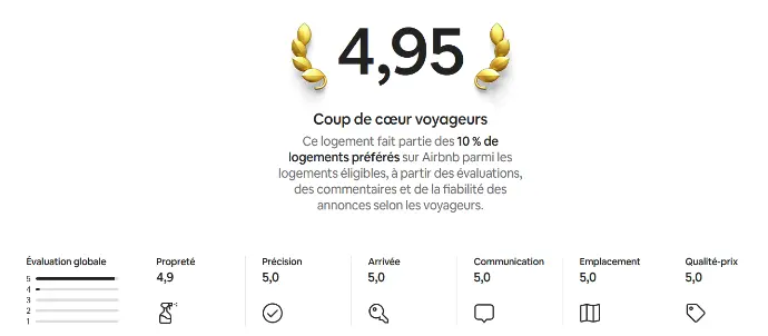 La note globale et les appréciations présentées ici sont issues d’un nombre limité de retours, collectés sur différentes plateformes de réservation telles qu’Airbnb et Booking.
